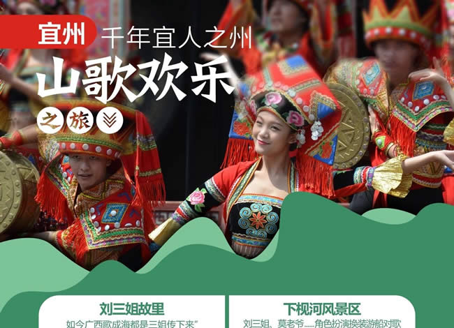 早餐后,乘車前往宜州國家AAAA級景區(qū)【劉三姐故里】景區(qū)包括龍江河、下枧河、流河寨、壯古佬、寨中保留有劉三姐故居、阿牛哥家、王媒婆家及劉三姐歌臺等,寨門有壯妹山歌迎賓,還有實景演出,是一個充滿民俗特色的旅游景區(qū)。下枧河是到達劉三姐故居的之地,兩岸青山綠水,河道中還有較多巖石,仿若“水上石林”。船 行其上時,還會時不時飄來山歌,非常有意思。到達流河寨,方可一探寨內(nèi)的劉三 姐故居。在下枧河與龍江河的交匯處有一塊“望妹石” ,相傳劉三姐掉下山崖后,阿牛哥總是站在這里癡癡地望著,希望能看到劉三姐平安歸來,后人便把他站的這塊石  頭叫做“望妹石”。乘船穿梭在河中,劉三姐與阿牛哥劃著小舟,唱著山歌的情景便不禁浮現(xiàn)。宜州是著名壯族歌仙劉三姐的故鄉(xiāng)。