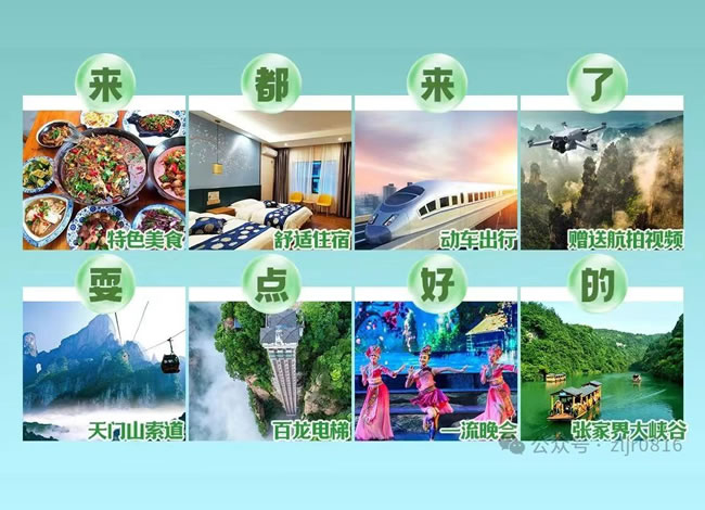 門票:張家界國家森林公園、百龍電梯單程、張家界大峽谷、天門山國家森林公園+時光扶梯單段+玻璃棧道一次性鞋套費用、張家界土司城(或老院子)、湘西苗寨、鳳凰古城接駁車、張家界民俗晚會;