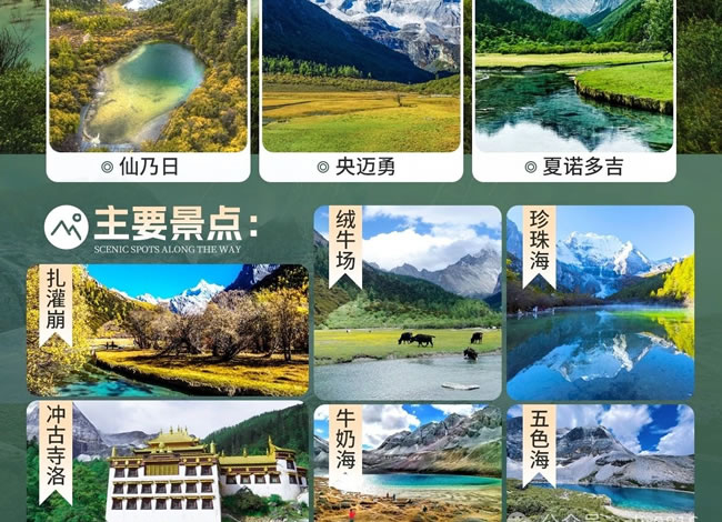 早上:7:00 早餐后乘車經(jīng)波瓦山到達(dá)【亞丁景區(qū)】(門票已含,首次觀光車 120/人自理,必須消費(fèi)),后在游客接待中心換乘景區(qū)觀光車抵達(dá)亞丁景區(qū)【扎灌崩】(40 公里,車程 1.5 小時(shí)),下車后游 客徒步上山直接抵達(dá)沖古寺。 中午:景區(qū)中餐自理,觀賞沖古寺風(fēng)光及神山仙乃日風(fēng)光,然后可自費(fèi)乘坐電瓶車(自理往返 70/人,單程 40/人)前往【洛絨牛場(chǎng)】(如徒步需 1-2 小時(shí)左右達(dá)到洛絨牛場(chǎng))。這里是觀【夏諾多吉神山】(意為金剛手菩薩,海拔 5958 米)【央邁勇神山】(意為金文殊菩薩,海拔 5958 米)的最佳地點(diǎn),讓神山圣水與心共鳴,盡情沉醉在夢(mèng)幻之地,后原路返回,到達(dá)【扎罐崩】乘觀光車返回住宿地。 晚上:回到日瓦鎮(zhèn)或稻城,晚餐后入住酒店。溫馨提示:因當(dāng)天游客出景區(qū)時(shí)間不統(tǒng)一,所以旅游車無(wú)法統(tǒng)一接送游客,游客可以選擇乘坐當(dāng)?shù)毓卉嚕?-10元/人自理)。亞丁景區(qū)分長(zhǎng)線—牛奶海、五色海和短線—珍珠海游覽。長(zhǎng)線游覽:因牛奶海和五色海海拔高,客人務(wù)必根據(jù)自身實(shí)際情況選擇是否前往(可選擇自費(fèi)騎馬305元/人至舍身崖約1.5小時(shí),再徒步至牛奶海和五色海需約1.5小時(shí),冬季11中旬至次年3約中旬馬幫停運(yùn),需徒步單程5KM往返10KM,徒步往返時(shí)間約4.5小時(shí))到達(dá)【牛奶海】,再徒步前往【五色?!浚ㄍ讲郊s20分鐘);【牛奶海】海拔4800米,又叫洛絨措,古冰川湖,狀如水滴,四周雪山環(huán)繞,湖水清瑩碧藍(lán),山止成瀑,以其玲瓏秀雅水色翠藍(lán)而著名。牛奶海在央邁勇的山坳里,呈扇貝形,中間是碧藍(lán)的雪水,周邊則是一圈乳白色環(huán)繞,這圈乳白色大致就是牛奶海名稱的由來(lái)。牛奶海是美麗的,遠(yuǎn)遠(yuǎn)望去,仿佛碧玉鑲嵌在雪山之中,純凈安詳。純凈的湖水給人以平和安寧的心境,而藍(lán)湛湛的海子并不透明,顯得神秘莫測(cè)。傳說(shuō)能治聾啞病的圣湖?!疚迳!亢0?600米,由于光的折射下,產(chǎn)生五種不同顏色而得名:其真名為“登崇措”。五色海它位于仙乃日與央邁勇之間,湖面呈圓形。面積0.7公頃,現(xiàn)代冰谷下伸至湖畔,雪山倒影湖面,呈現(xiàn)奇幻的色彩。是藏區(qū)著名的圣湖(佛經(jīng)中贊譽(yù)該湖與西藏羊巴雍措齊名),據(jù)傳能“返演歷史,預(yù)測(cè)未來(lái)”。短線游覽:游客可乘坐景區(qū)觀光車抵達(dá)扎灌崩,徒步500米到達(dá)沖古寺,前往仙乃日神山下的圣湖【珍珠海】短線游覽(單程約1.5KM,徒步前往約40分鐘),海拔3950米?!菊渲楹!吭诓卣Z(yǔ)中稱為“卓瑪拉措”,是仙乃日的融雪形成的海子。面積約0.1平方公里。密林中的珍珠海如一顆鑲嵌在蓮花寶座上的綠寶石,碧波蕩漾,粼粼波光中透出無(wú)限清麗,湖畔四周,參翠如屏。春天湖邊片片杜鵑花燦爛怒放,秋天層林盡染,倒影著五彩斑斕的世界,令人目眩神迷?!緛喍【皡^(qū)】以仙乃日、央邁勇、夏諾多吉三座雪峰為核心區(qū),北南向分布,三座雪山呈品字形,三峰藏名為“念青貢嘎日松貢布”,意為“三怙主雪山”,是眾生朝圣積德之所在地。由于特殊的地理環(huán)境和自然氣候,形成了獨(dú)特的地貌和自然景觀,是中國(guó)保存最完整的一處自然生態(tài)系統(tǒng)。